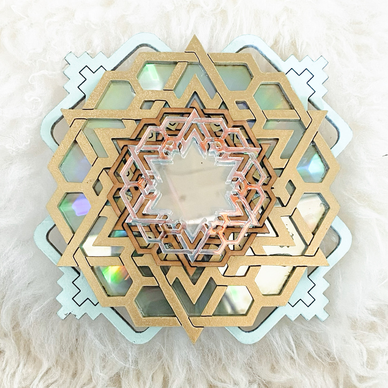 All original designs meditatively hand-drawn, translated into digital form and lasercut by the artist herself. A combination of sustainably sourced materials including fibreboard, acrylic and compact discs, painted, stained or varnished and glued together in unique combinations. They have lacunas at the back which provide an easy way to hang up on your wall, or alternatively thread your choice of rope or chain through to suspend.