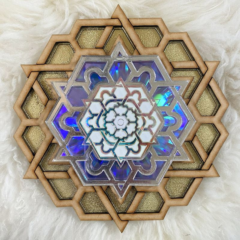 All original designs meditatively hand-drawn, translated into digital form and lasercut by the artist herself. A combination of sustainably sourced materials including fibreboard, acrylic and compact discs, painted, stained or varnished and glued together in unique combinations. They have lacunas at the back which provide an easy way to hang up on your wall, or alternatively thread your choice of rope or chain through to suspend.