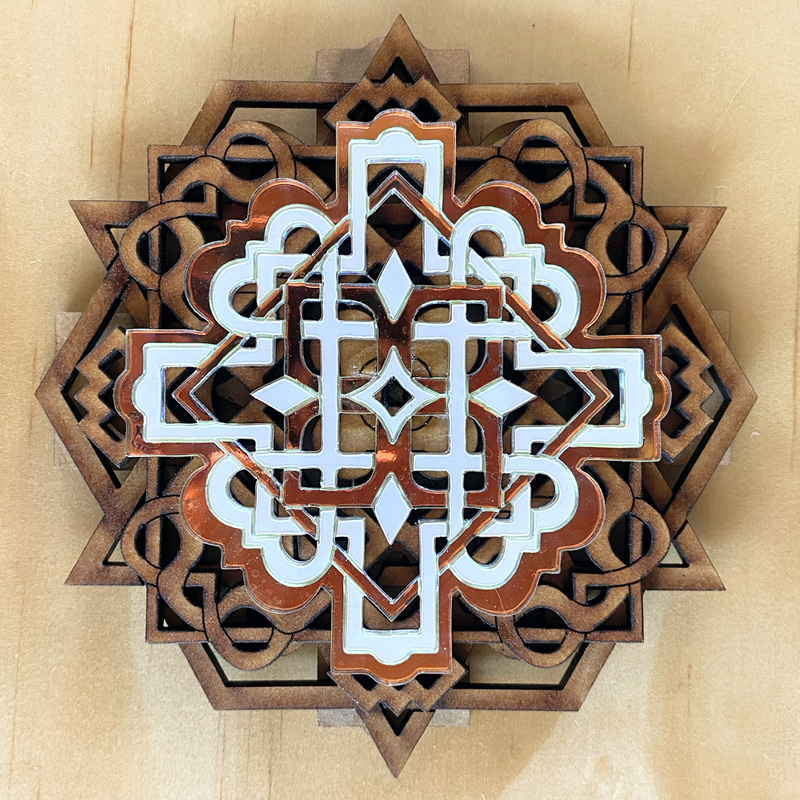 All original designs meditatively hand-drawn, translated into digital form and lasercut by the artist herself. A combination of sustainably sourced materials including fibreboard, acrylic and compact discs, painted, stained or varnished and glued together in unique combinations. They have lacunas at the back which provide an easy way to hang up on your wall, or alternatively thread your choice of rope or chain through to suspend.