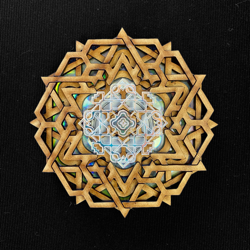 All original designs meditatively hand-drawn, translated into digital form and lasercut by the artist herself. A combination of sustainably sourced materials including fibreboard, acrylic and compact discs, painted, stained or varnished and glued together in unique combinations. They have lacunas at the back which provide an easy way to hang up on your wall, or alternatively thread your choice of rope or chain through to suspend.